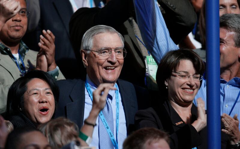 2008: Former VP Walter Mondale through the years In this Wednesday, Aug. 27, 2008, file photo, former Vice President Walter Mondale, center, and Sen. Amy Klobuchar, D-Minn., right, are seen after announcing their presidential nominee during the roll call of states on the third day of the Democratic National Convention in Denver. (AP Photo/Charlie Neibergall, File)