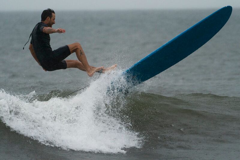 Tropical Storm Henri impact A surfer smiles as he bails on a wave as Tropical Storm Henri brings strong surf and high winds to the area, Sunday, Aug. 22, 2021, in the Queens borough of New York. (AP Photo/John Minchillo) (John Minchillo/AP)