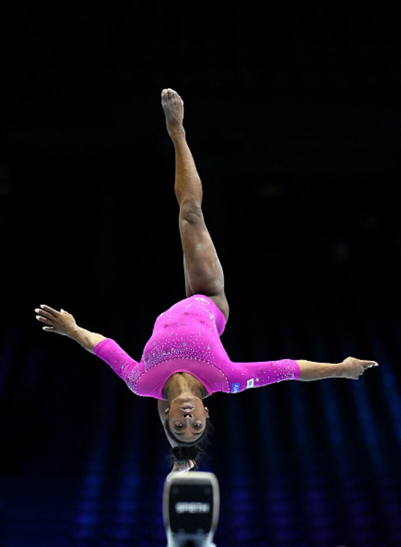 2023 Artistic Gymnastics World Championships ANTWERP, BELGIUM - SEPTEMBER 28: Simone Biles of United States practices during the 2023 FIG Artistic Gymnastics World Championships Training Session at the Antwerp Sportpaleis on September 28, 2023 in Antwerp, Belgium. (Photo by Matthias Hangst/Getty Images) (Matthias Hangst/Getty Images)