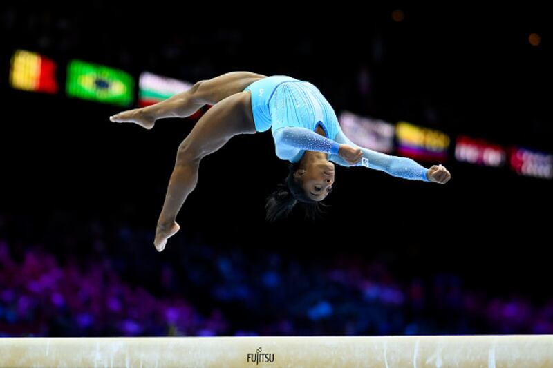2023 Artistic Gymnastics World Championships ANTWERP, BELGIUM - OCTOBER 01: Simone Biles of the Team United States competes on Balance Beam during Women's Qualifications on Day Two of the FIG Artistic Gymnastics World Championships at the Antwerp Sportpaleis on October 01, 2023 in Antwerp, Belgium. (Photo by Matthias Hangst/Getty Images) (Matthias Hangst/Getty Images)