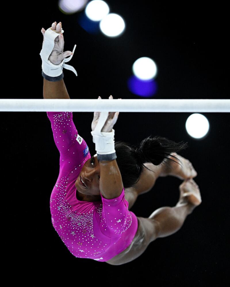 2023 Artistic Gymnastics World Championships ANTWERP, BELGIUM - OCTOBER 01: Simone Biles of Team United States in action on Uneven Bars during Women's Qualifications on Day Two of the FIG Artistic Gymnastics World Championships at the Antwerp Sportpaleis on October 01, 2023 in Antwerp, Belgium. (Photo by Matthias Hangst/Getty Images) (Matthias Hangst/Getty Images)