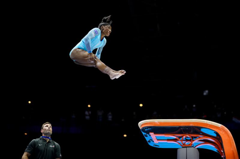 2023 Artistic Gymnastics World Championships ANTWERP, BELGIUM - OCTOBER 01: Simone Biles of Team United States competes on Vault during Women's Qualifications on Day Two of the FIG Artistic Gymnastics World Championships at the Antwerp Sportpaleis on October 01, 2023 in Antwerp, Belgium. (Photo by Matthias Hangst/Getty Images) (Matthias Hangst/Getty Images)