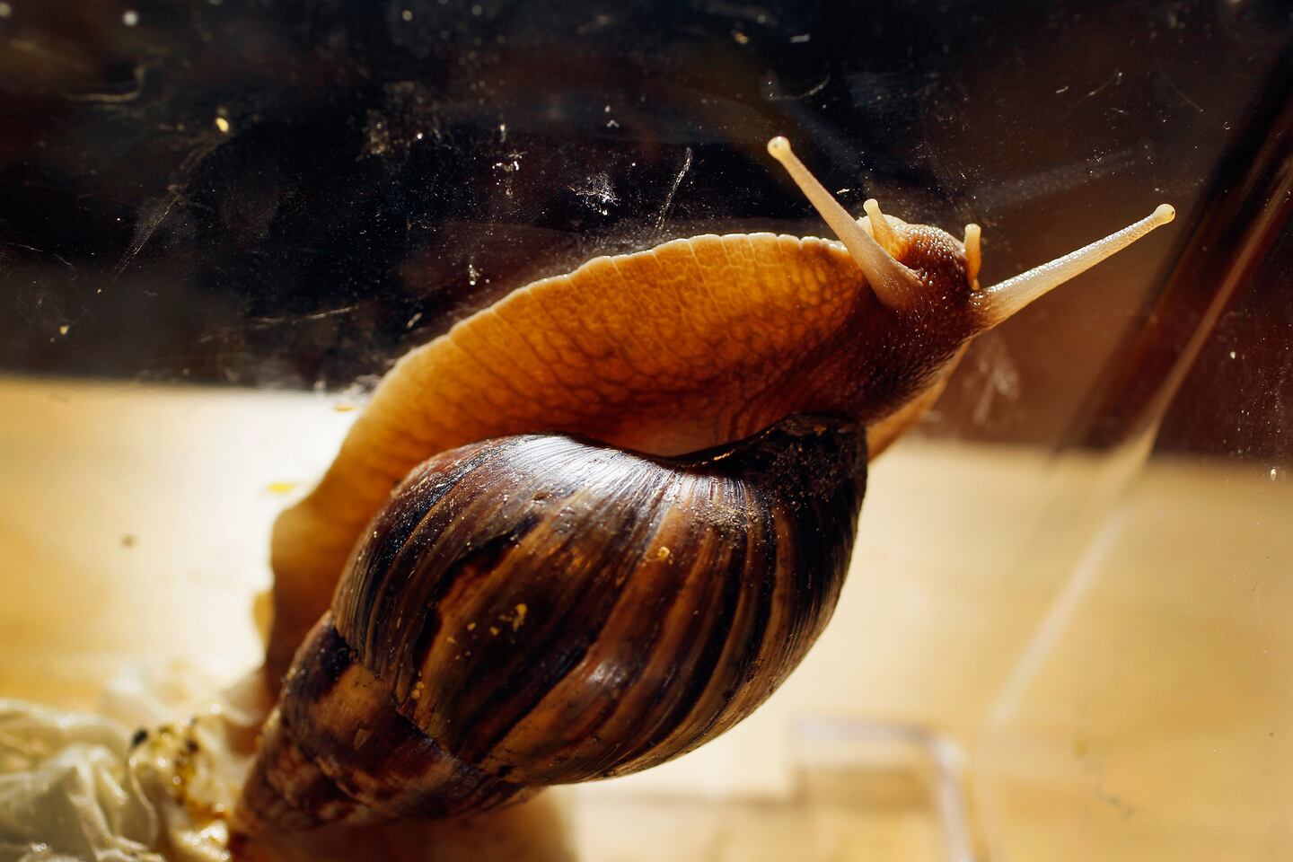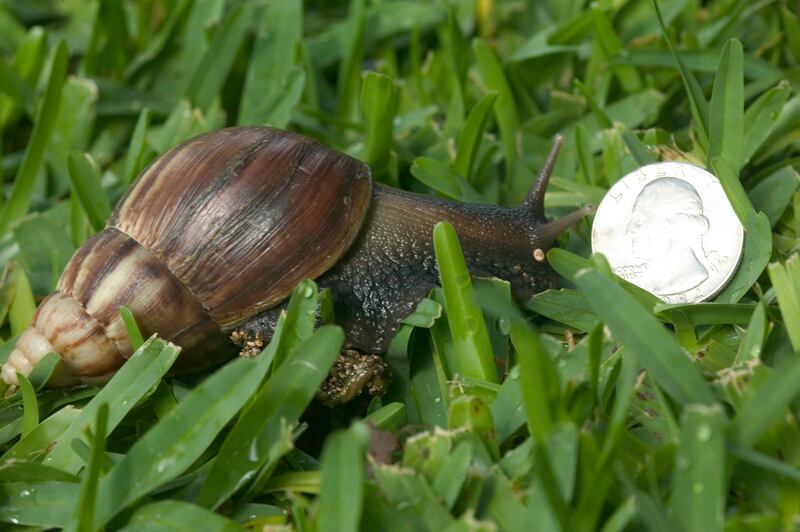 Photos: Giant African land snails The U.S. Department of Agriculture said “scientists consider the giant African snail (GAS) … to be one of the most damaging snails in the world. It is known to consume at least 500 different species of economically important agricultural plants, including breadfruit, cassava, cocoa, papaya, peanut, rubber, and most varieties of beans, peas, cucumbers, and melons, as well as plans of horticultural, cultural and medicinal value.” (Phil Mislinski/Getty Images)