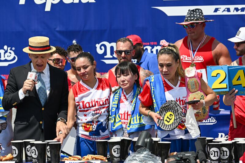Nathan's Annual Hot Dog Eating Contest NEW YORK, NEW YORK - JULY 04: Mayoi Ebihara (C) competes during the 2023 Nathan's Famous Fourth of July International Hot Dog Eating Contest at Coney Island on July 04, 2023 in the Brooklyn borough of New York City. The annual contest, which began in 1972, draws thousands of spectators to Nathan’s Famous located on Surf Avenue. (Photo by Alexi J. Rosenfeld/Getty Images) (Alexi Rosenfeld/Getty Images)