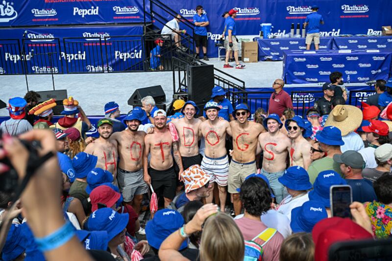 Nathan's Annual Hot Dog Eating Contest NEW YORK, NEW YORK - JULY 04: Spectators cheer during the 2023 Nathan's Famous Fourth of July International Hot Dog Eating Contest at Coney Island on July 04, 2023 in the Brooklyn borough of New York City. The annual contest, which began in 1972, draws thousands of spectators to Nathan’s Famous located on Surf Avenue. (Photo by Alexi J. Rosenfeld/Getty Images) (Alexi Rosenfeld/Getty Images)