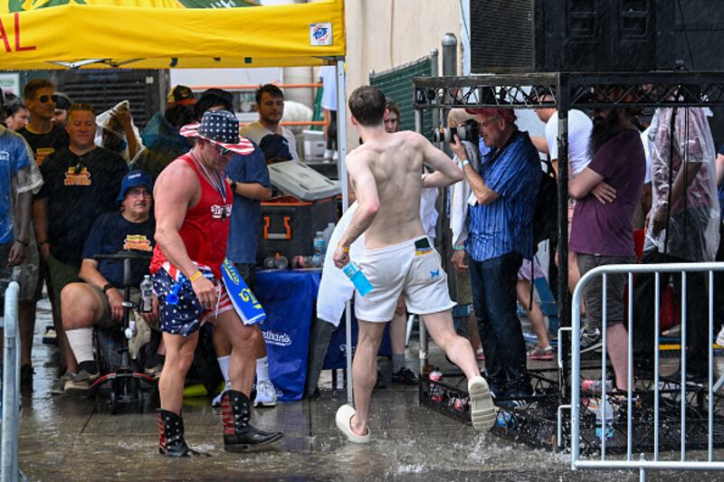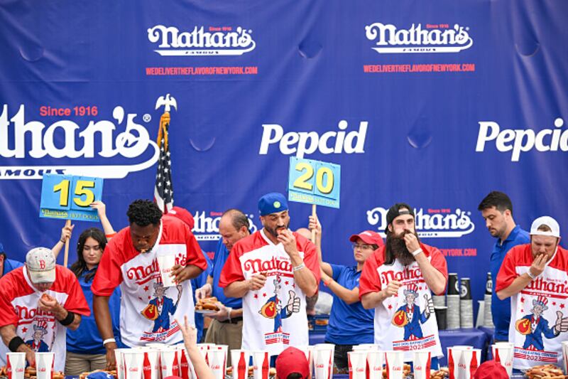 Nathan's Annual Hot Dog Eating Contest NEW YORK, NEW YORK - JULY 04: Contestants compete in the 2023 Nathan's Famous Fourth of July International Hot Dog Eating Contest on July 4, 2023 at Coney Island in the Brooklyn borough of New York City. The men's contest was postponed due to thunderstorms but later happened without spectators allowed into the "arena." The annual contest, which began in 1972, draws thousands of spectators to Nathan’s Famous located on Surf Avenue. (Photo by Alexi J. Rosenfeld/Getty Images) (Alexi Rosenfeld/Getty Images)