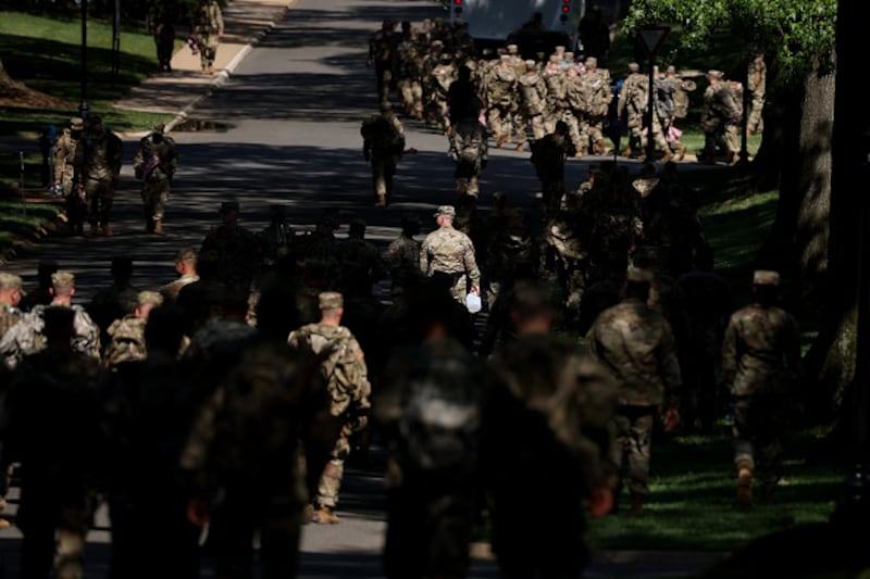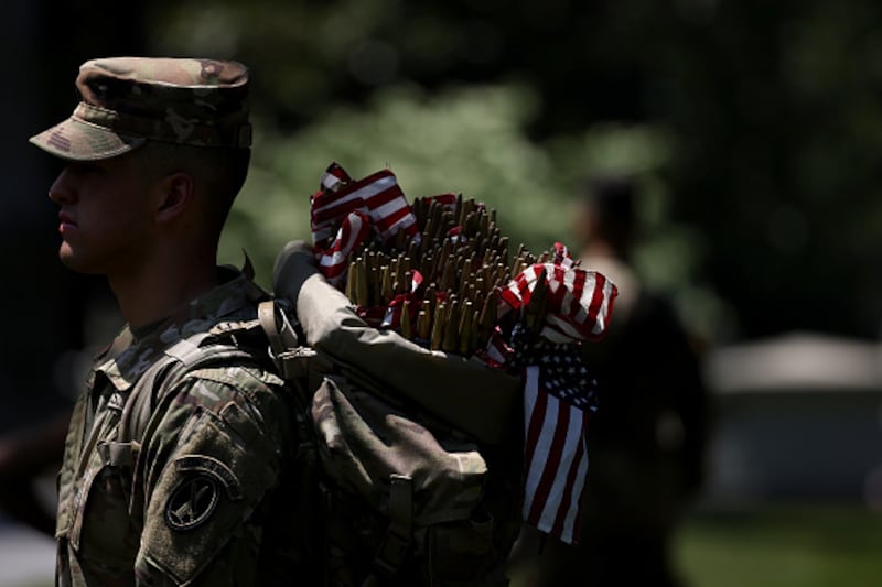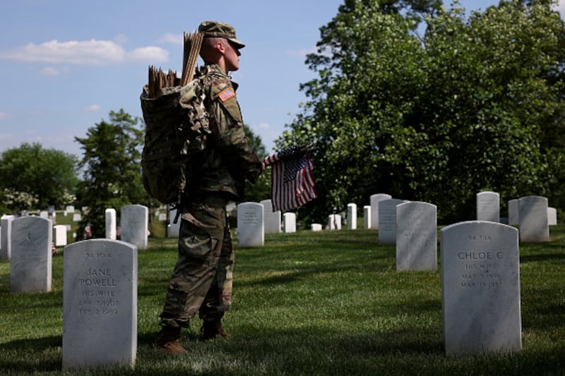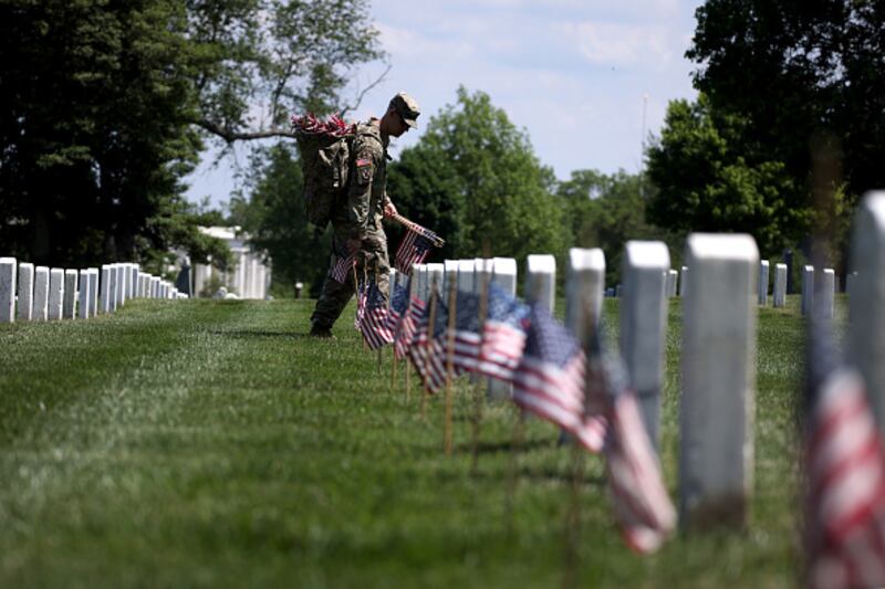 Arlington Cemetery flags ARLINGTON, VIRGINIA - MAY 27: A service member walsk through “Flags In” ceremony ahead of the Memorial Day weekend at Arlington National Cemetery on May 27, 2021 in Arlington, Virginia. For the first time in 20 years, members from all joint services worked to place flags at each of the 260,000 headstones in the cemetery. Arlington Cemetery recently announced they would be relaxing the visitor restrictions imposed at the beginning of the Coronavirus Pandemic, which has affected ceremonies and traditions over the last year. (Photo by Anna Moneymaker/Getty Images) (Anna Moneymaker/Getty Images)