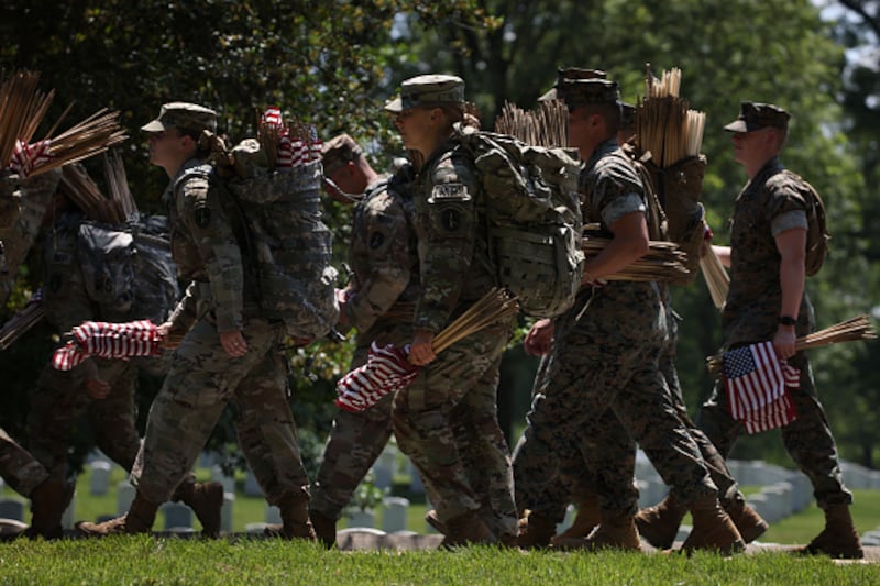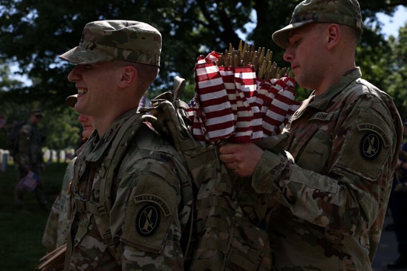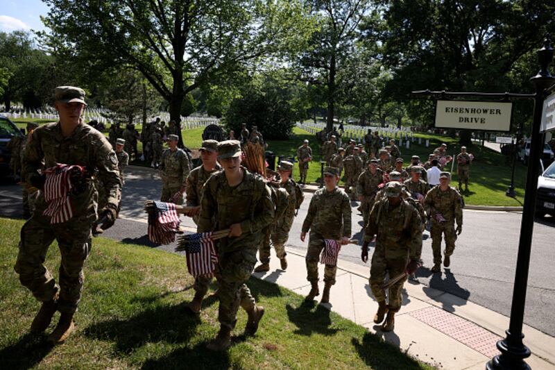 Arlington Cemetery flags ARLINGTON, VIRGINIA - MAY 27: Service members walk through Arlington National Cemetery carrying small American Flags for the “Flags In” ceremony ahead of the Memorial Day weekend on May 27, 2021 in Arlington, Virginia. For the first time in 20 years, members from all joint services worked to place flags at each of the 260,000 headstones in the cemetery. Arlington Cemetery recently announced they would be relaxing the visitor restrictions imposed at the beginning of the coronavirus (COVID-19) pandemic, which has affected ceremonies and traditions over the last year. (Photo by Anna Moneymaker/Getty Images) (Anna Moneymaker/Getty Images)