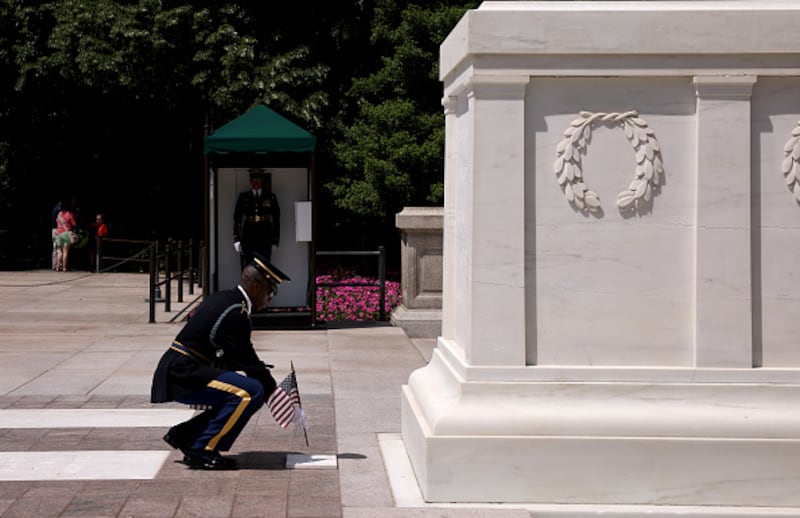 Arlington Cemetery flags ARLINGTON, VIRGINIA - MAY 27: A service member places a flag at the Tomb of the Unknown Soldier as part of the “Flags In” ceremony ahead of the Memorial Day weekend at Arlington National Cemetery on May 27, 2021 in Arlington, Virginia. For the first time in 20 years, members from all joint services worked to place flags at each of the 260,000 headstones in the cemetery. Arlington Cemetery recently announced they would be relaxing the visitor restrictions imposed at the beginning of the Coronavirus Pandemic, which has affected ceremonies and traditions over the last year. (Photo by Anna Moneymaker/Getty Images) (Anna Moneymaker/Getty Images)