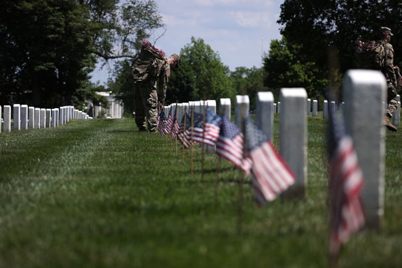 Arlington Cemetery flags ARLINGTON, VIRGINIA - MAY 27: A service member places small American flags in front of a gravesites as part of the “Flags In” ceremony ahead of the Memorial Day weekend at Arlington National Cemetery on May 27, 2021 in Arlington, Virginia. For the first time in 20 years, members from all joint services worked to place flags at each of the 260,000 headstones in the cemetery. The cemetery recently announced they would be relaxing the visitor restrictions imposed at the beginning of the coronavirus (COVID-19) pandemic, which has affected ceremonies and traditions over the last year. (Photo by Anna Moneymaker/Getty Images) (Anna Moneymaker/Getty Images)
