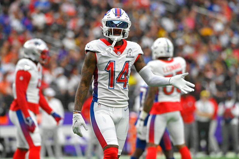 2022 Pro Bowl AFC wide receiver Stefon Diggs (14), of the Buffalo Bills, reacts to a play against the NFC during the first half of the Pro Bowl NFL football game, Sunday, Feb. 6, 2022, in Las Vegas. (AP Photo/David Becker) (David Becker/AP)