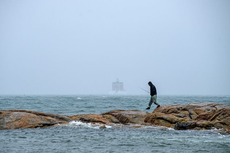Photos: Nor'easter brings heavy rain, strong winds to New England Fisherman Adam Lurch fishes from the rocks off Eastern Point along the Long Island Sound in Groton, Conn., on Tuesday, Oct. 26 2021, as a nor'easter was expected to bring heavy rain and strong winds. (Mark Mirko/Hartford Courant via AP)