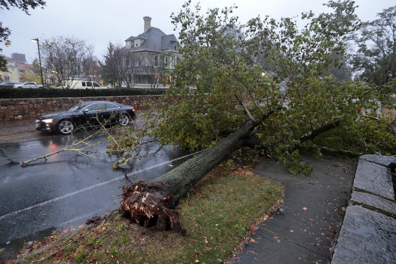 Photos: New England surveys damage in Nor'easter's aftermath A car drives past a downed tree on Hawthorn Street in New Bedford, Mass., on Wednesday, Oct. 27, 2021. (Peter Pereira/The Standard-Times via AP)