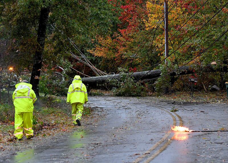 Photos: New England surveys damage in Nor'easter's aftermath Crew members of the North Attleboro Electric Department survey the damage done by a toppled tree that took down utility lines as a primary line arcs on Reservoir Street in North Attleboro, Mass., on Wednesday, Oct. 27, 2021. (Mark Stockwell/The Sun Chronicle via AP)