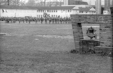 Kent State shootings: View, past the Kent State University Victory Bell (upon which is written "Strike", of a line of Ohio National Guardsman assembled on the Commons, Kent, Ohio, on May 4, 1970. (Howard Ruffner/Getty Images)
