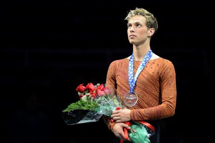 Photos: Adam Rippon through the years 2017: Silver medalist Adam Rippon (left) of the United States, gold medalist Nathan Chen of the United States and bronze medalist Sergei Voronov of Russia pose after competing in the Men's Free Skating during Day 2 of 2017 Bridgestone Skate America at Herb Brooks Arena on November 25, 2017, in Lake Placid, New York. (Tim Bradbury/Getty Images)