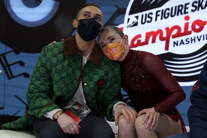 Photos: Adam Rippon through the years 2022: Mariah Bell waits with coaches Adam Rippon and Rafael Arutyunyan for her scores after skating in the Ladies Free Skate during the U.S. Figure Skating Championships at Bridgestone Arena on January 7, 2022, in Nashville, Tennessee. (Matthew Stockman/Getty Images)