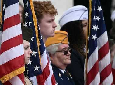 Memorial Day: Flag bearers stand at attention in the amphitheater at the Tomb of the Unknown Soldier in Arlington National Cemetery in Arlington, Virginia, on Memorial Day. (BRENDAN SMIALOWSKI/AFP via Getty Images)