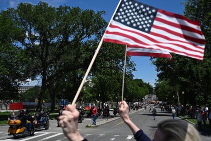 US-MILITARY-VETERANS-MEMORIAL DAY People wave flags as bikers ride in Washington, D.C., during Memorial Day weekend. (ALEX WROBLEWSKI/AFP via Getty Images)