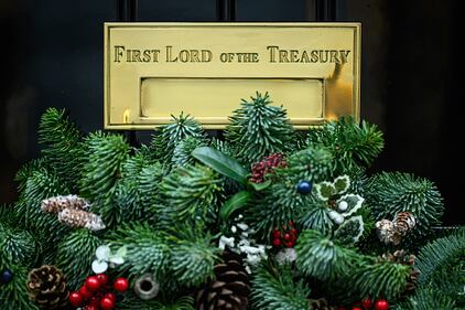 Photos: British PM Rishi Sunak lights Downing Street Christmas tree A detail view of the wreath on the door of 10 Downing St., ahead of the switching on of the Christmas tree lights on November 28, 2022, in London. (Leon Neal/Getty Images)