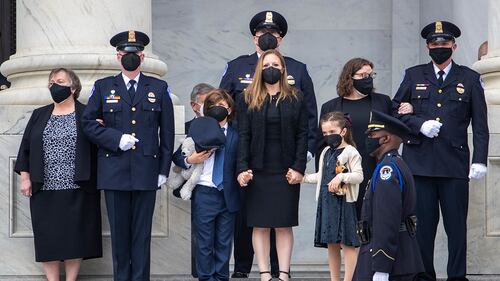 Capitol Police Officer William 'Billy' Evans lies in honor at U.S. Capitol Logan Evans and his sister Abigail Evans, along with their mother Shannon Terranova, watch as the casket of their father, slain U.S. Capitol Police officer William "Billy" Evans, arrives on Capitol Hill in Washington, Tuesday, April 13, 2021. Evans, 41, who served for 18 years on the Capitol Police force, was killed April 2, when a vehicle rammed into him and another officer during an attack at a security barricade, will lie in honor in the Rotunda. (Susan Walsh/AP Photo)