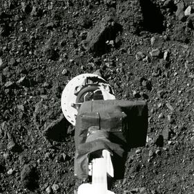 OSIRIS-REx This Aug. 11, 2020 photo shows the sampling arm of the OSIRIS-REx spacecraft during a rehearsal for an approach to the "Nightingale" sample site on the surface of the asteroid Bennu. After almost two years circling the ancient asteroid, OSIRIS-REx will attempt to descend to the treacherous, boulder-packed surface and snatch a handful of rubble on Tuesday, Oct. 20, 2020. (NASA/Goddard/University of Arizona via AP) (AP)