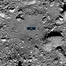 OSIRIS-REx The sample site, named “Nightingale”, is pictured in the photo. The image of the Nightingale site is overlaid with a graphic of the OSIRIS-REx spacecraft to illustrate the targeted touchdown site which is ringed by dangerous obstacles. The imagery was taken with Teledyne CCD image sensors. Image credits: NASA/Goddard/University of Arizona