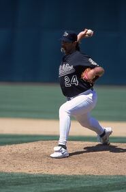 Through the years 21 May 2000: Pitcher Doug Jones #24 of the Oakland Athletics in action during the game against the Minnesota Twins at the Network Associates Coliseum in Oakland, California. The Athletics defeated the Twins 11-1.Mandatory Credit: Jon Ferrey /Allsport (Jonathan Ferrey/Getty Images)