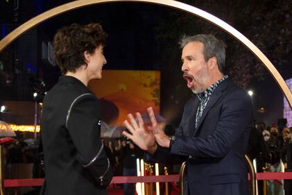 'Dune' UK premiere Timothee Chalamet, left and Denis Villeneuve react upon arrival at the premiere of the film 'Dune' on Monday, Oct. 18, 2021 in London. (Photo by Joel C Ryan/Invision/AP) (Joel C Ryan/Joel C Ryan/Invision/AP)