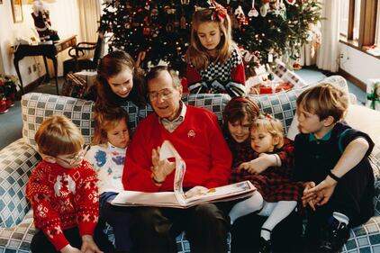 Photos: Former first daughter Barbara Bush through the years 1991: President George H. W. Bush reads to grandchildren Pierce, Marshall, Barbara, Lauren, Jenna, Ashley Bush and Sam LeBlond at Camp David on Christmas Eve. (Lee Corkran/Sygma via Getty Images)
