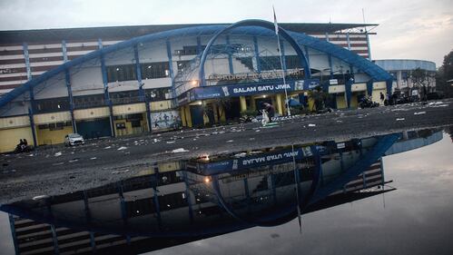 Indonesia stadium stampede This picture shows Kanjuruhan stadium the morning after a football match between Arema FC and Persebaya Surabaya in Malang, East Java on October 2, 2022. (PUTRI/AFP via Getty Images)