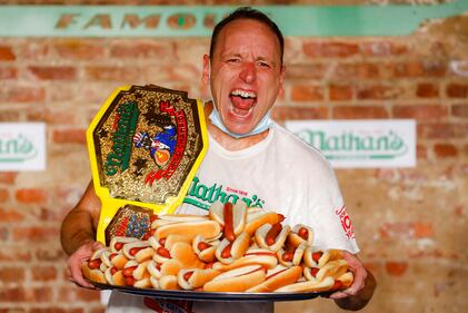 Joey Chestnut sets record eating 75 hot dogs at Nathan’s hot dog eating contest Competitive eater Miki Sudo eats a women's world record of 48 and a half hot dogs to win the women's division of the Nathan's Famous July Fourth hot dog eating contest, Saturday, July 4, 2020, in the Brooklyn borough of New York. (AP Photo/John Minchillo) (John Minchillo/AP)