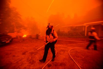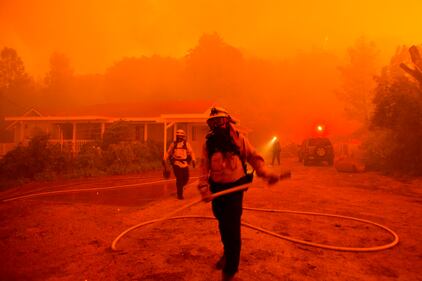 'Lake Fire' burns more than 10,000 acres in Southern California Firefighters walk in smoke and haze from the Lake Hughes fire in Angeles National Forest on Wednesday, Aug. 12, 2020, north of Santa Clarita, Calif. (AP Photo/Ringo H.W. Chiu)