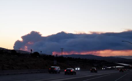'Lake Fire' burns more than 10,000 acres in Southern California The plume of smoke from the Lake Fire in the Angeles National Forest, by Lake Hughes, 60 miles north of Los Angeles, is seen from the 14 freeway in Agua Dulce, California, on August 12, 2020. (ROBYN BECK/AFP via Getty Images)