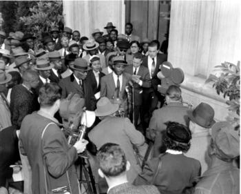 King's battle with the law continued. He was arrested thirty times for his participation in civil rights activities. Here he is being charged with loitering in 1958. (Charles Moore)