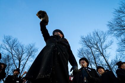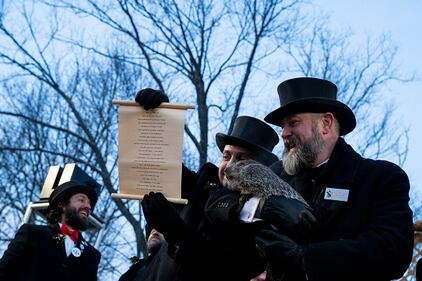 Groundhog Day PUNXSUTAWNEY, PA - FEBRUARY 02: Groundhog handler AJ Derume holds Punxsutawney Phil, who saw his shadow, predicting a late spring during the 136th annual Groundhog Day festivities on February 2, 2023 in Punxsutawney, Pennsylvania. Groundhog Day is a popular tradition in the United States and Canada. A crowd of upwards of 5,000 people spent a night of revelry awaiting the sunrise and the groundhog's exit from his winter den. If Punxsutawney Phil sees his shadow he regards it as an omen of six more weeks of bad weather and returns to his den. Early spring arrives if he does not see his shadow, causing Phil to remain above ground.