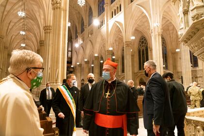 St. Patrick's Day 2021 Cardinal Timothy Dolan, center, talks with a member of the clergy inside St. Patrick's Cathedral, Wednesday, March 17, 2021 in New York. A largely virtual St. Patrick’s Day is planned for New York City, one year after the annual parade celebrating Irish heritage was canceled because of the COVID-19 pandemic. (AP Photo/Mark Lennihan) (Mark Lennihan/AP)