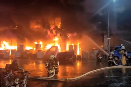 Photos: Taiwan fire leaves 25 dead, dozens hurt In this image taken from video by Taiwan's EBC, firefighters shoot water into a building that caught fire in Kaohsiung, in southern Taiwan on Thursday, Oct. 14, 2021. (EBC via AP)