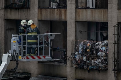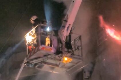 Photos: Taiwan fire leaves 25 dead, dozens hurt In this image taken from video by Taiwan's EBC, firefighters on a crane fight a fire in Kaohsiung, in southern Taiwan on Thursday, Oct. 14, 2021. (EBC via AP)