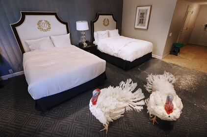 Photos: White House turkey pardon hopefuls Corn, Cob arrive in Washington National Thanksgiving Turkey candidates Corn and Cob rest in their fourth-floor room at the Willard InterContinental Hotel on November 23, 2020, in Washington, D.C. (Chip Somodevilla/Getty Images)