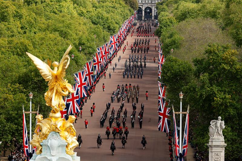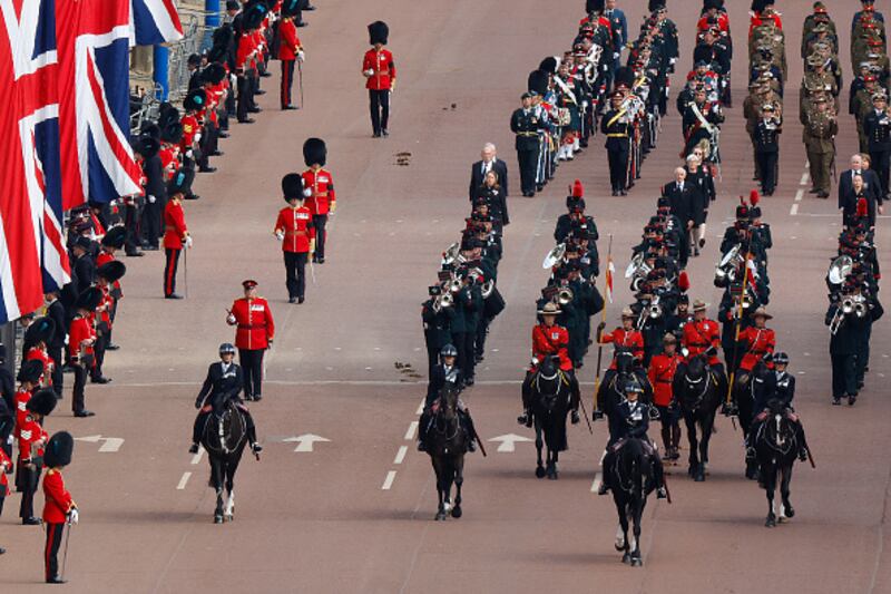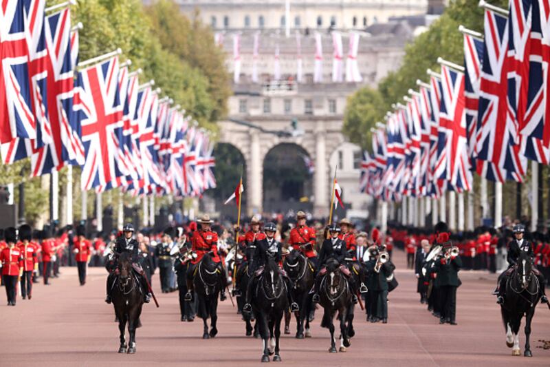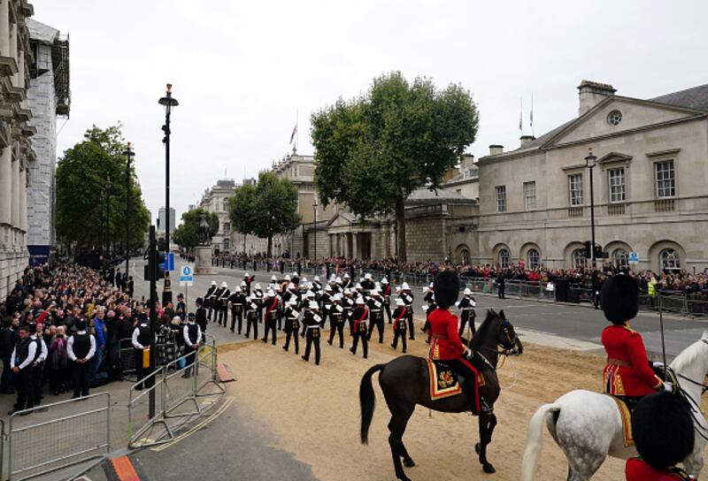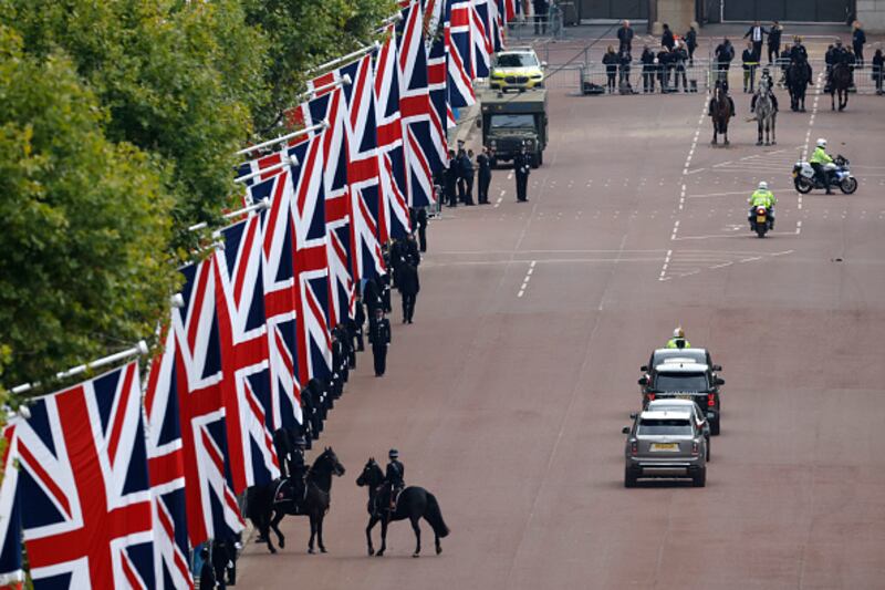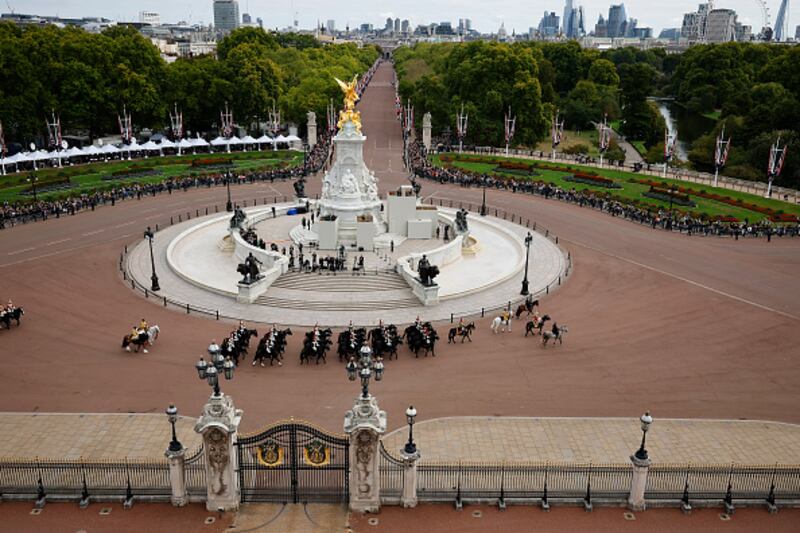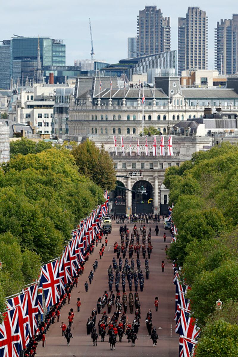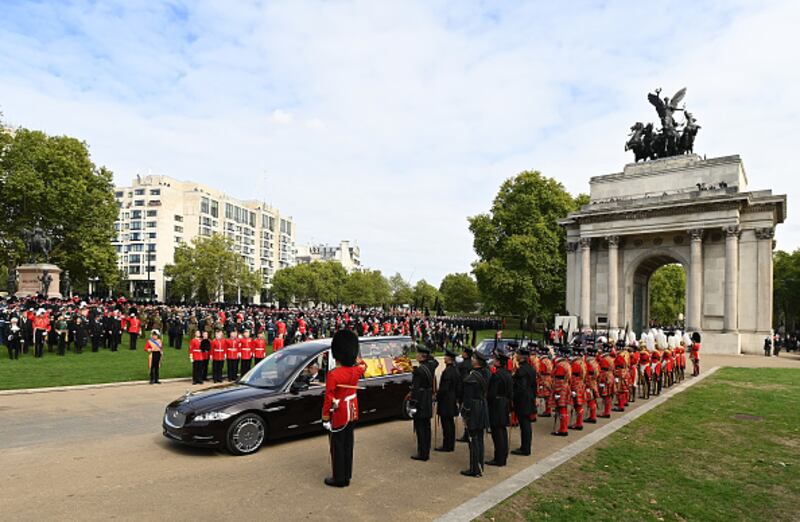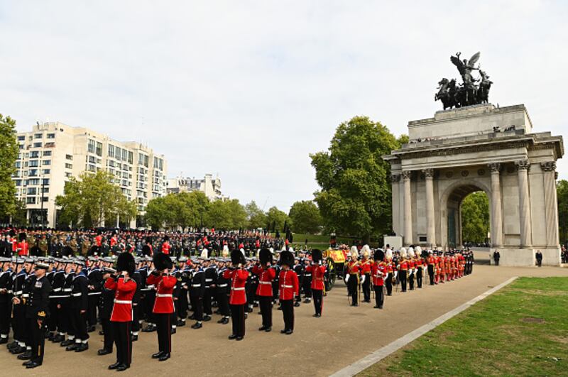 Update 7:50 a.m. EDT Sept. 19: As the procession continues toward Wellington Arch, gun salutes are being fired in Hyde Park, according to the AP.