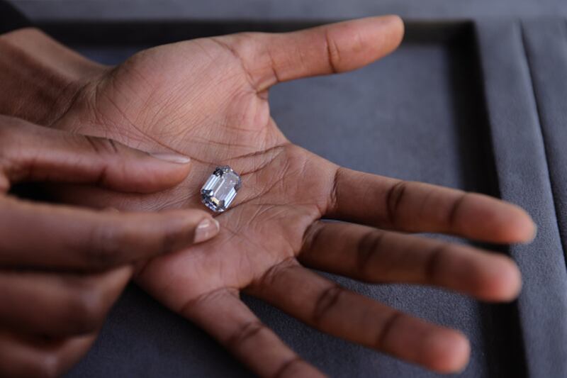 Photos: Rare 15.1-carat blue diamond fetches nearly $57.5M at auction NEW YORK, NEW YORK - FEBRUARY 15: The De Beers Cullinan Blue diamond is shown before being auctioned at Sotheby's on February 15, 2022 in New York City. The blue diamond is the largest and most valuable to appear at auction. (Photo by Michael Loccisano/Getty Images) (Michael Loccisano/Getty Images)
