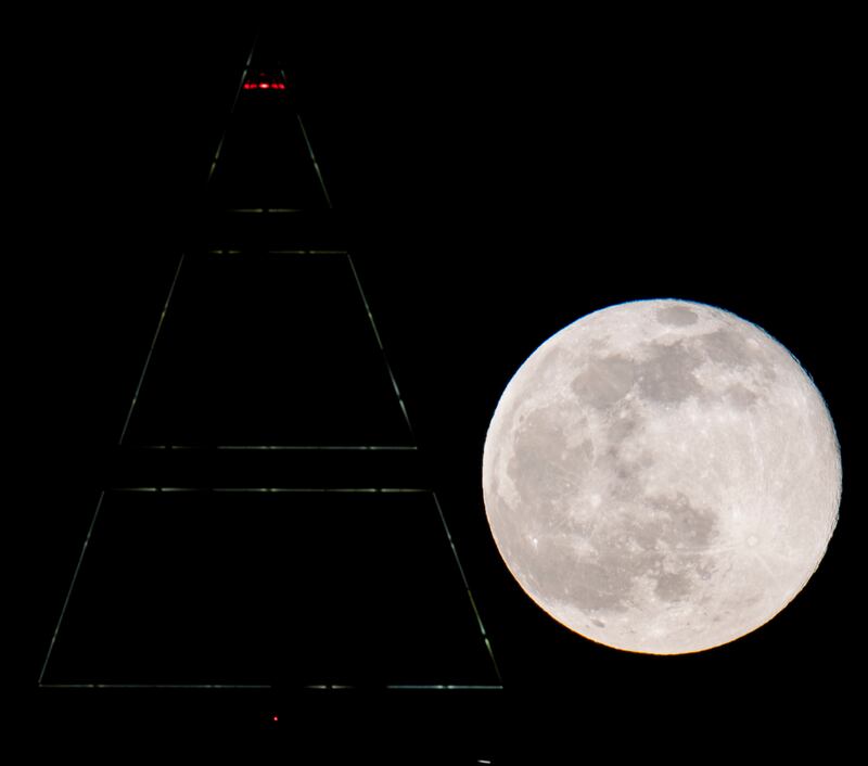 Photos: February 2021 Snow Moon brightens the night sky The full moon is above the top of the Messeturm in Frankfurt on Feb. 28, 2021. (Boris Roessler/picture alliance via Getty Images)