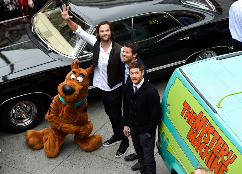 Jared Padalecki Jensen Ackles, from right, Misha Collins and Jared Padalecki pose with Scooby-Doo as they greet fans before a screening of "Supernatural" during the 35th annual PaleyFest at the Dolby Theatre on Tuesday, March 20, 2018, in Los Angeles. (Photo by Chris Pizzello/Invision/AP) (Chris Pizzello/Chris Pizzello/Invision/AP)