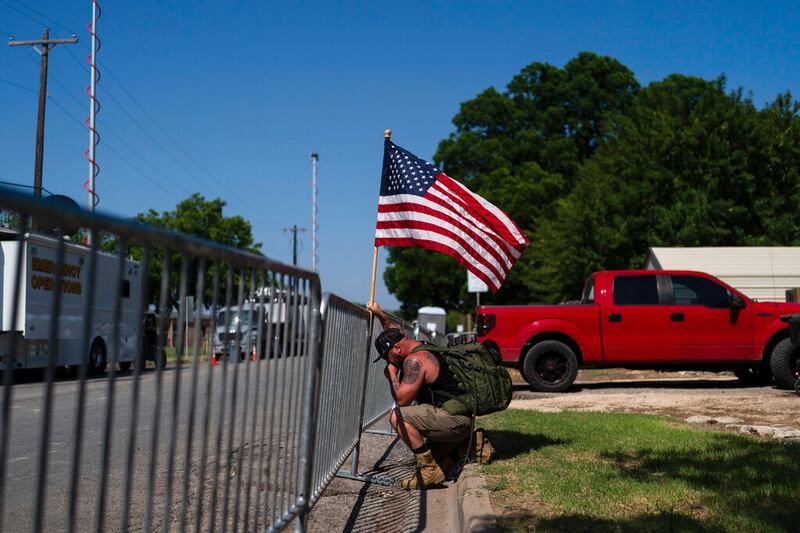 Uvalde in mourning Jarrod Tomassi, 45, holds an American flag outside Robb Elementary School while praying for the victims killed in this week's school shooting in Uvalde, Texas, Saturday, May 28, 2022. (AP Photo/Jae C. Hong) (Jae C. Hong/AP)