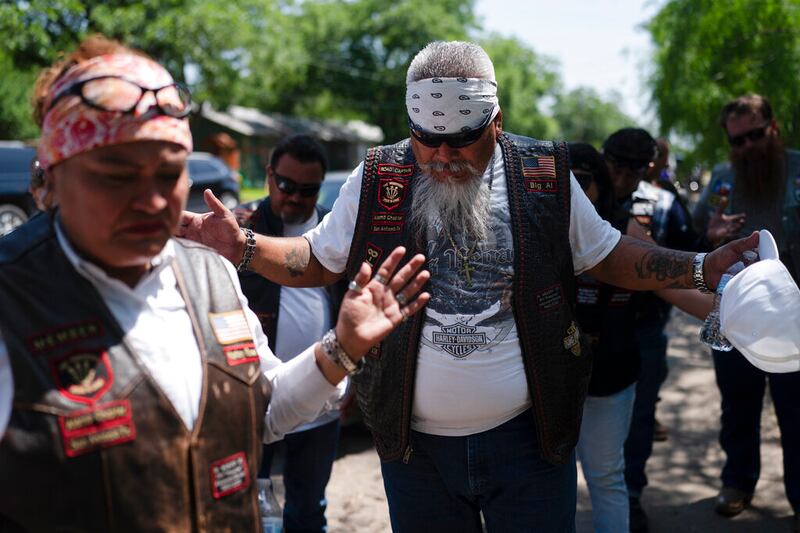 Uvalde in mourning A group of bikers pray outside Robb Elementary School for the victims killed in this week's school shooting in Uvalde, Texas Saturday, May 28, 2022. (AP Photo/Jae C. Hong) (Jae C. Hong/AP)