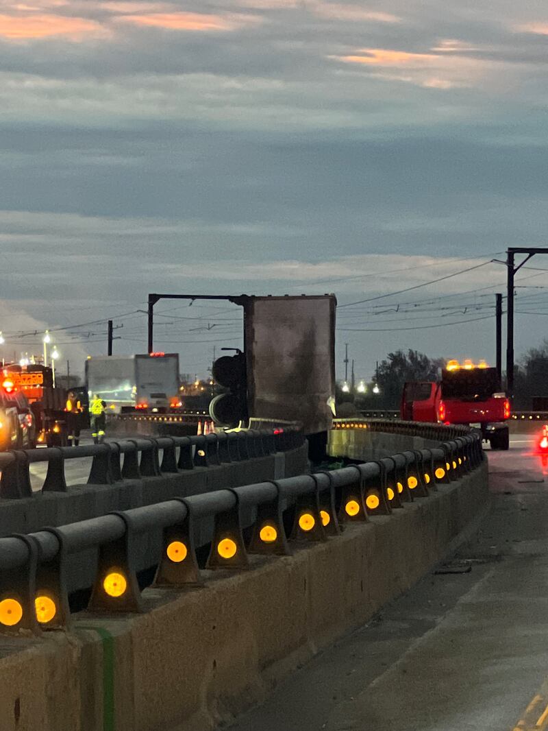 State police described the truck as remaining “perpendicular, hanging off the bridge in between the east and westbound lanes.” The crash also caused the truck to burst into flames.