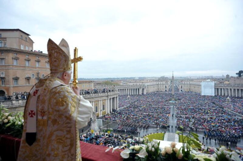 Through the years VATICAN CITY, VATICAN - APRIL 04: Pope Benedict XVI delivers his Easter 'Urbi et Orbi' blessing from the central balcony of St Peter's Basilica on April 04, 2010 in Vatican City, Vatican. The Urbi et Orbi is a blessing and message delivered twice-yearly to the City and the World in 63 languages.(Photo by L'Osservatore Romano - Vatican Pool/Getty Images) (Pool/Getty Images)