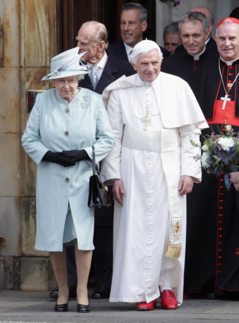 Through the years EDINBURGH, UNITED KINGDOM - SEPTEMBER 16: Queen Elizabeth II and Pope Benedict XVI leave to meet school children outside the Palace of Holyroodhouse, the Queen's official residence in Scotland, on September 16, 2010 in Edinburgh, United Kingdom. Pope Benedict XVI is conducting the first state visit to the UK by a Pontiff. During the four day visit Pope Benedict will celebrate mass, conduct a prayer vigil as well as beatify Cardinal Newman at an open air mass in Cofton Park. His Holiness will meet The Queen as well as political and religious representatives. (Photo by Dan Kitwood/Getty Images) (Dan Kitwood/Getty Images)