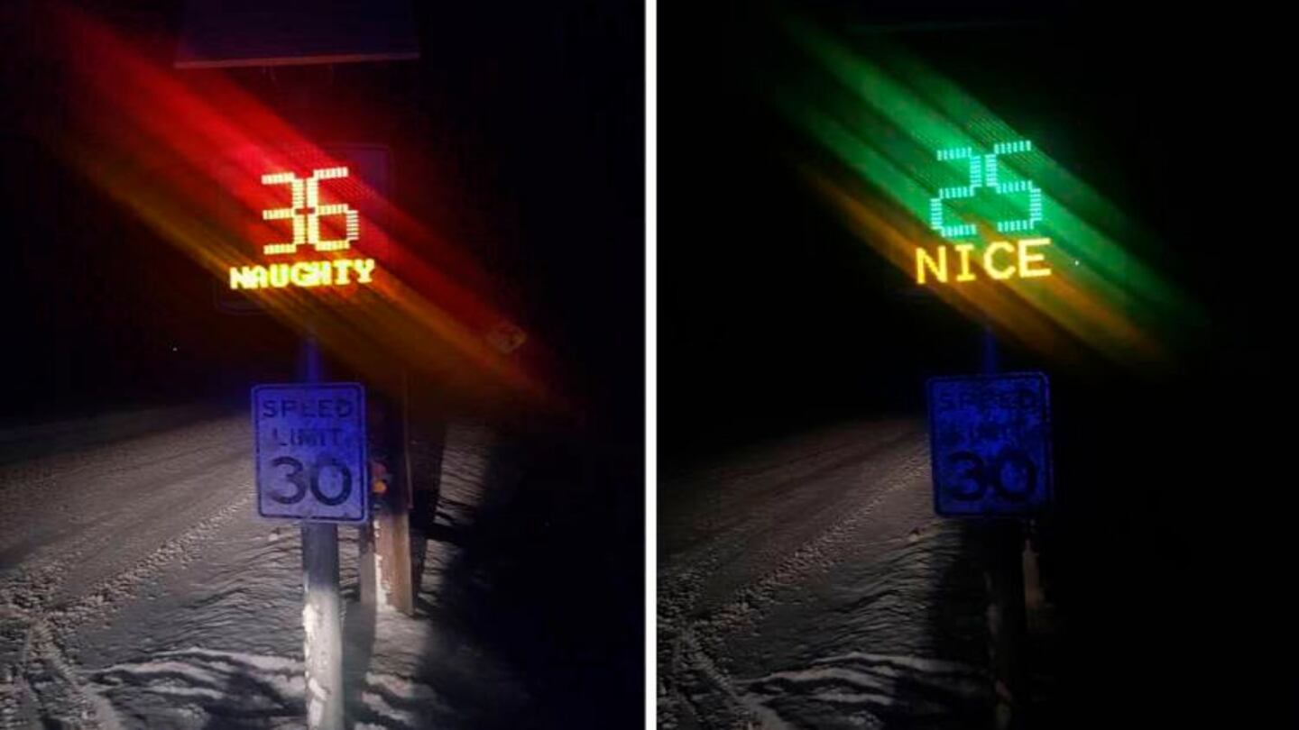 According to CNN, the Chester Police Department debuted the holiday-themed radar sign recently that literally illuminates “naughty” for speeders and “nice” for speed limit-abiding drivers.
